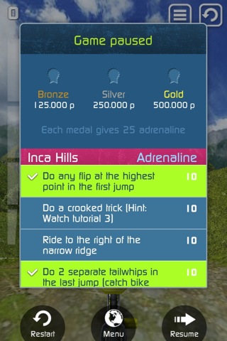 Um weitere Kurse freizuschalten, muss man Adrenalin-Punkte sammeln. Neben einer Medaille kann man auch bestimmte Herausforderungen bestehen, etwa mit einem bestimmten Trick an einem bestimmten Sprung. Leider sind die Herausforderungen, genau wie das ganze Spiel, in englischer Sprache beschrieben. Das führt leider dazu, das man oft nicht so genau weiß, was man überhaupt machen muss.