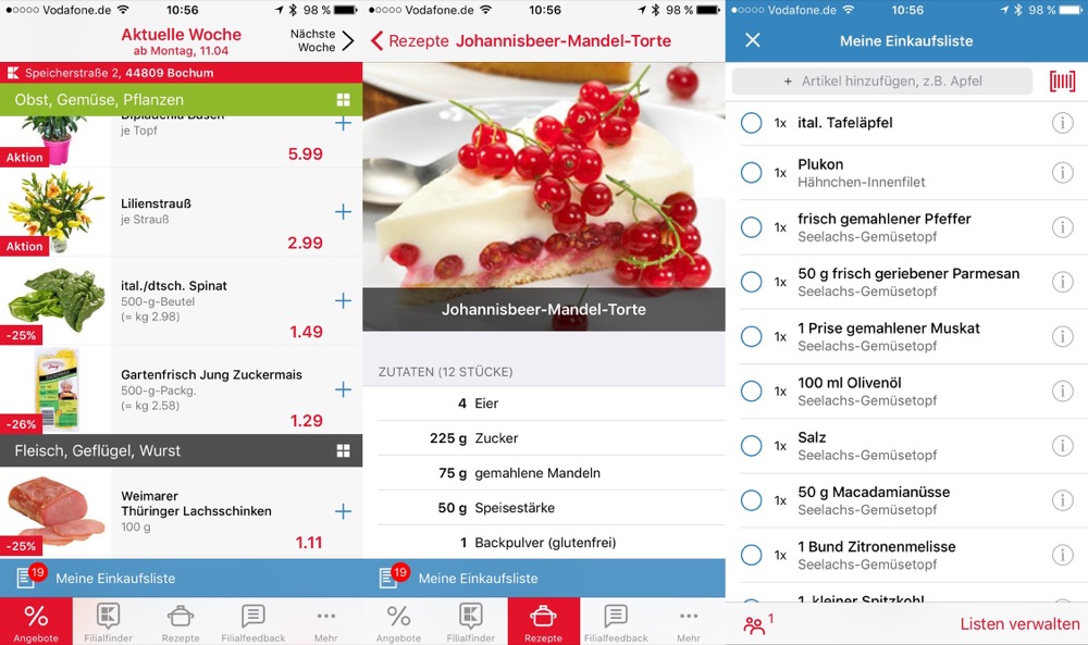 Nach dem Start der App wird zunächst einmal eure bevorzugte Filiale lokalisiert. Das funktioniert entweder über eine manuelle Suche oder über die Freigabe der Ortungsdaten. Direkt danach präsentiert die App alle Angebote der aktuellen und kommenden Woche, mit nur einem Fingertipp können weitere Informationen zum Produkt abgerufen werden, außerdem kann man es direkt auf die Einkaufsliste packen. Dort können Artikel zudem auch manuell oder über eine Barcode-Scanner hinzugefügt werden. Die Einkaufsliste kann nach einer Registrierung auch mit mehreren Nutzern verwaltet werden.
