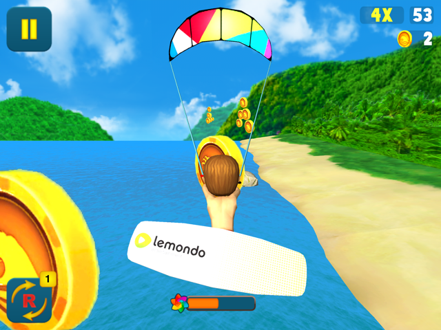 Die Steuerung ist dabei an die klassischen Endless Runner wie etwa Temple Run angelehnt: Mit Wischgesten nach oben, unten, links und rechts manövriert man den sportlichen Protagonisten aus Kite Surfer durch das unwegsame Gewässer, und sammelt dabei unterwegs auch eine Menge Münzen ein. Und wenn ich sage, eine Menge, dann ist das auch wirklich so gemeint.