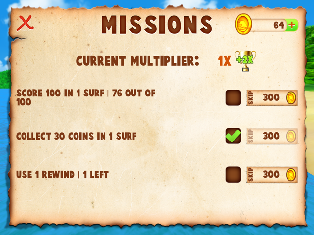 Ist es in vielen anderen Freemium-Spielen sehr mühselig, sich Upgrades mit gesammelten Münzen zu kaufen, geschieht dies in Kite Surfer beinahe spielend. Die Münzen liegen zuhauf herum, und bei einem guten Run bekommt man schon einmal so viele Goldstücke zusammen, dass es für ein kleines Update des Charakters reicht. Die kostenpflichtigen Münzpakete kann man daher meines Erachtens nach getrost außen vor lassen.