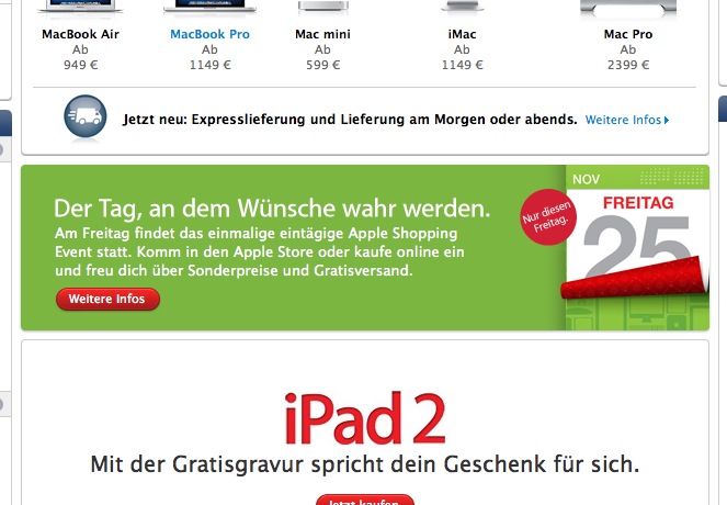 Bereits um 0:00 Uhr werden bei Arktis.de die Schalter umgelegt und die Preise gesenkt. Egal ob günstige iPhone 4S Hüllen, iPad 2 Halterungen, MacBook Pro Hüllen aber auch Apple iPods, iMacs oder ausgefallene Geschenkideen wie der iPhone Helikopter oder coole Gadgets für Nerds und Geeks, hier soll es alles geben. Zu finden sind die Angebote und Preise ab Freitag auf dieser Sonderseite, oft aber wohl nur in einer beschränkten Anzahl.