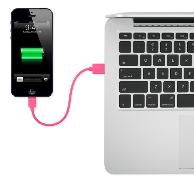 Fangen wir mit dem Kabel von Belkin an: Verfügbar ist es für 19,95 Euro (Apple Online Store) in den Farben pink, blau und orange. Die Länge von nur 15 Zentimetern ist natürlich insbesondere dann praktisch, wenn man das iPhone zum Beispiel an den USB-Port der Apple-Tastatur anschließen will, ohne dass sich ein halbes Meter Kabel auf dem Schreibtisch verirrt.