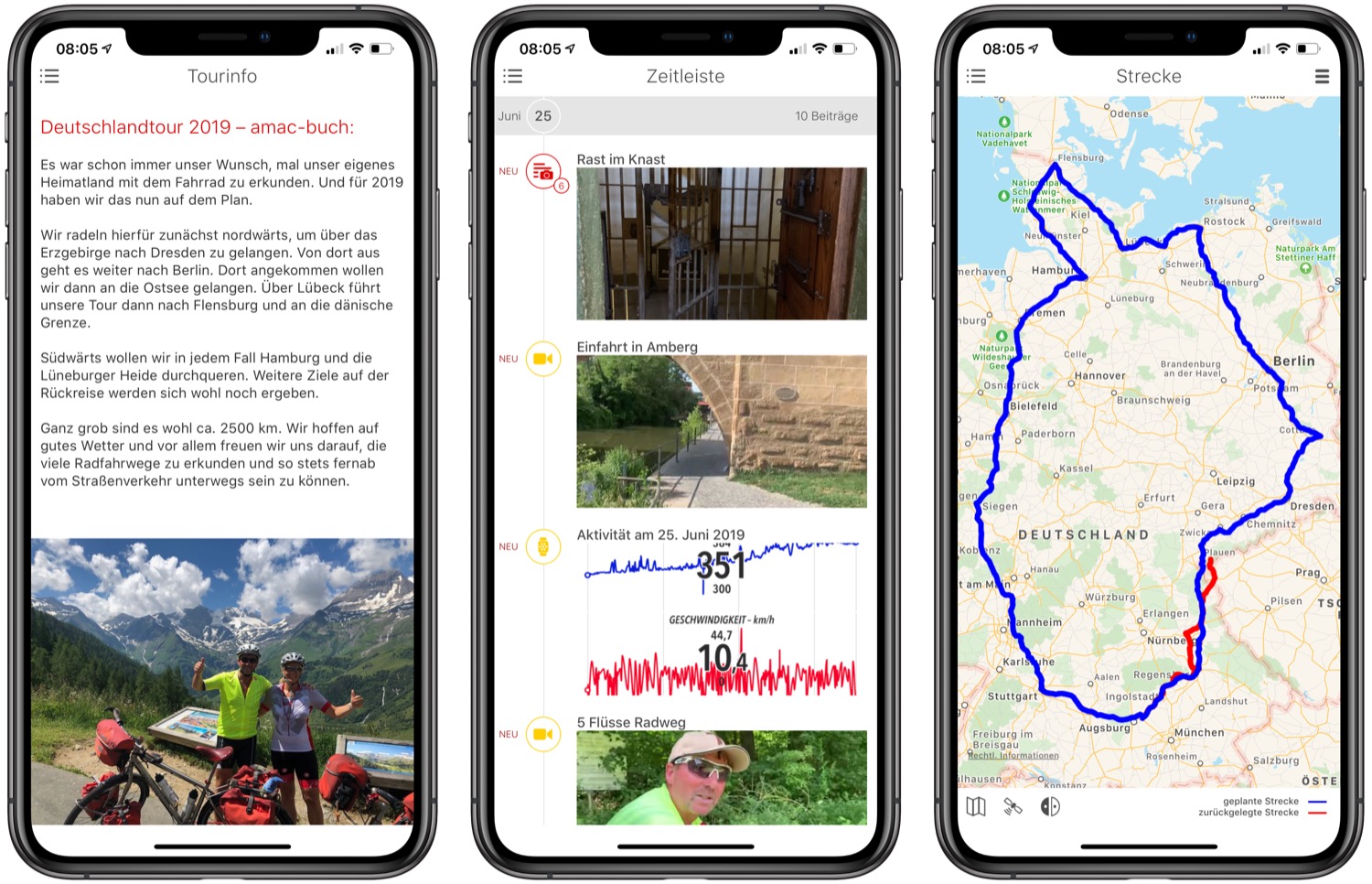Und mit der iOS-App „Leben atmen – Deutschland“ (App Store-Link) könnt ihr die Radtour live mitverfolgen. Hier könnt ihr alle Daten abrufen, Bilder und Videobotschaften einsehen, die exakte Position sehen und alle Einträge im Tagebuch lesen. Die Bedienung ist sehr einfach und die Darstellung auf einer Zeitleiste sehr übersichtlich.