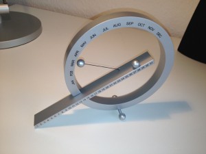 Der Kalender besteht aus zwei Elementen. In einem Kreis werden die Monate Januar bis Dezember dargestellt (abgekürzt in englischer Schreibweise), auf einer Leiste findet man die Tage von 1 bis 31. Das jeweilige Datum stellt man per Hand ein, in dem man eine kleine magnetische Kugel weiter schiebt.