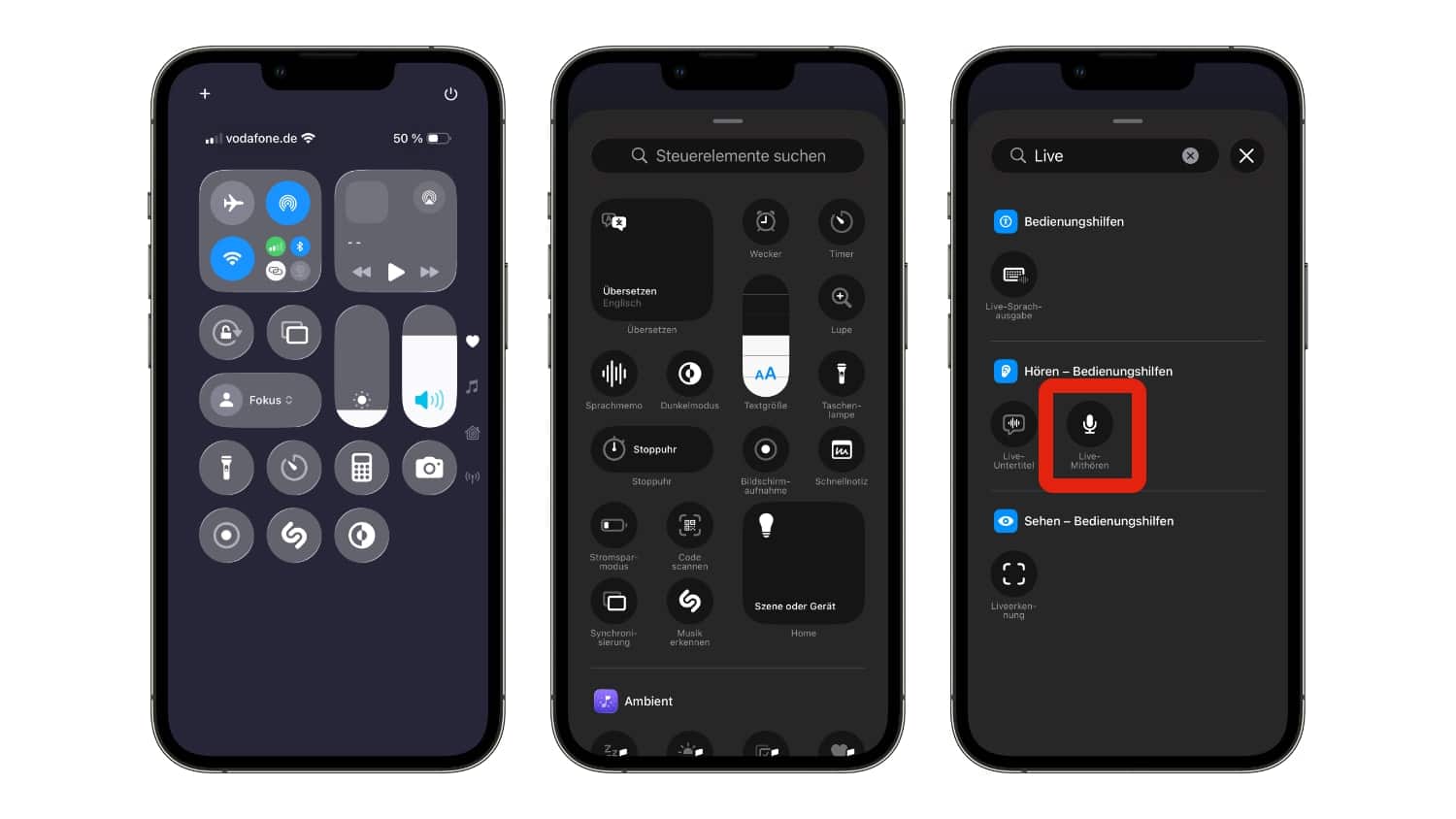 - Es öffnet sich ein Menü samt Suchzeile. Tippt in diese „Live“ oder „Live Mithören“ ein und wählt unter „Hörhilfen“ dann „Live Mithören“ aus.