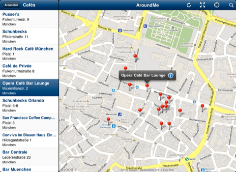 Egal ob man in der Umgebung die nächste Bar, eine Tankstelle, ein Hotel oder ein Kino sucht: Mit AroundMe kann man die Suche um ein Vielfaches beschleunigen. Einfach den gewünschten Suchbegriff eingeben oder die passende Kategorie auswählen und schon werden die Treffer in der unmittelbaren Umgebung angezeigt.