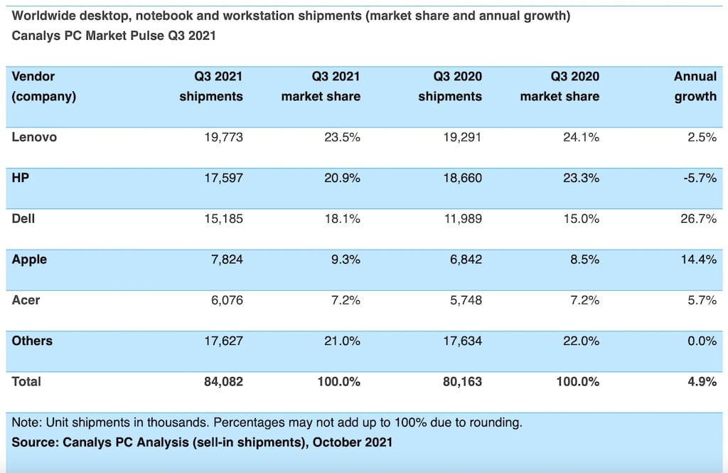 Schaut man sich die Analyse von Canalys an, ist der Markt für Computer um 4,9 Prozent im Vergleich zum Vorjahr gewachsen. Apple hingegen konnte Zuwächse in Höhe von 14,4 Prozent verbuchen und liegt daher deutlich über dem Durchschnitt. Marktführer bleibt weiterhin Lenovo mit 19,773 Millionen verkauften Einheiten und einem Marktanteil von 23,5 Prozent. Apple kommt mit 7,824 Millionen verkaufter Macs auf einen Marktanteil von 9,3 Prozent, was Platz vier in der Rangliste von Canalys bedeutet. Die gesamte Analyse kann hier nachgelesen werden.