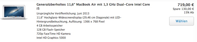 Wenn es nicht der geringfügig bessere Prozessor sein soll, lohnt sich auch ein Blick in den Apple Refurbished Store. Dort verkauft Apple seine bisherige Lagerware und generalüberholte Kundenrückläufer mit voller Garantie zu sehr fairen Preisen.