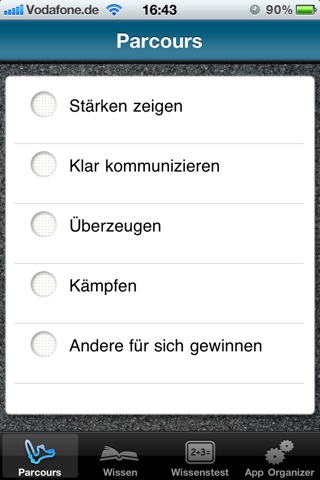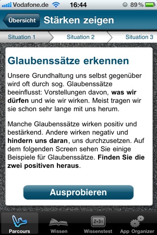 In einem „Parcours“ lernt der Nutzer anhand 21 verschiedener Situationen, richtig zu reagieren, und so den passenden Weg zur Durchsetzung der eigenen Argumente zu finden. Weiterhin gibt es Übungen und Beispiele, in denen das eigene Stärkeprofil erstellt und Schwächen ausgemerzt werden können, sowie wirkungsvolle Praxistipps für alle Lebenslagen.