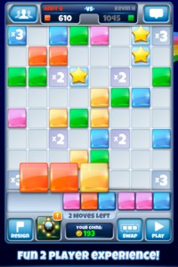 Dabei muss man die auf dem Spielfeld verteilt bunten Blöcke mit den Dreiersteinen aus der eigenen Ablage so ergänzen, dass möglichst viele Kombinationen von mindestens drei gleichfarbigen Blöcken entstehen. Je länger die Kette ist, desto mehr Punkte gibt es natürlich – zusätzlich gibt es Multiplikator-Felder, mit denen man die eigene Punktzahl weiter erhöhen kann.