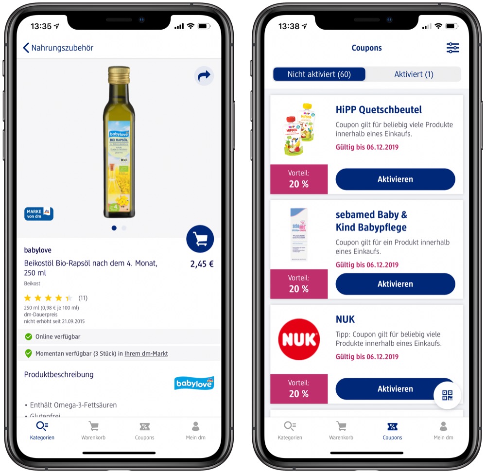 Zunächst einmal ist es positiv, dass ich keine zweite App benötige. Die Coupons der Glückskind-Anwendung finden sich auch in der neuen dm-App. Zusätzlich kann man auch auf den gesamten Produktkatalog zurückgreifen und per App eine Online-Bestellung aufgeben.