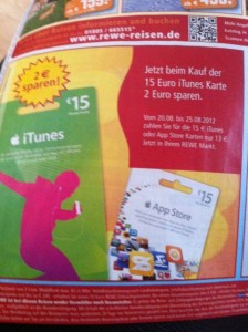appgefahren-Leser André hat uns vor wenigen Minuten mit einem Bild aus dem aktuellen Rewe-Prospekt für die kommende Woche versorgt. Im Angebot ist die iTunes-Karte im Wert von 15 Euro, sie wird vom 20. bis zum 25. August für 13 Euro angeboten. Ich gehe davon aus, dass dieses Angebot deutschlandweit und auch in Kaufpark-Filialen gelten wird.