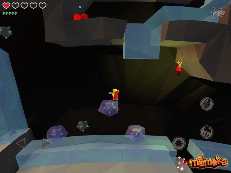 Die Steuerung ist in Momoka dabei sehr einfach gehalten. Mit zwei Buttons steuert man die kleine Heldin nach links und rechts, mit zwei weiteren virtuellen Knöpfen kann man Springen und später auch Schiessen. Alternativ kann man iPhone, iPad oder auch Apple TV mit einem zertifizierten Gamecontroller verbinden, um Momoka damit zu spielen.