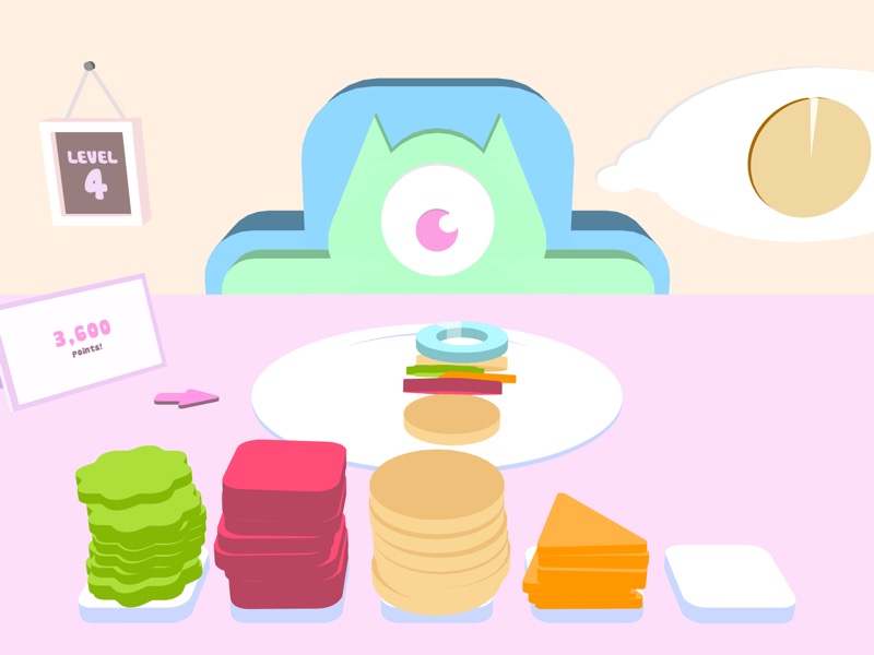 Das Schwierige an diesem Gameplay ist dabei nicht etwa die tickende Uhr im Hintergrund, sondern vor allem die exakte Platzierung der Zutaten – darunter Käse, Salat, Fleisch-Patties oder Zwiebelringe – auf dem Teller des Monsters. Mit einfachen Drag-and-Drop-Gesten wird diese Aktion durchgeführt, beachten sollte man aber, dass die Konstruktion, die nach jedem erfolgreich absolvierten Level anspruchsvoller wird, nicht in sich zusammenfällt. Läuft dann die Zeit ab, ist die Partie beendet.