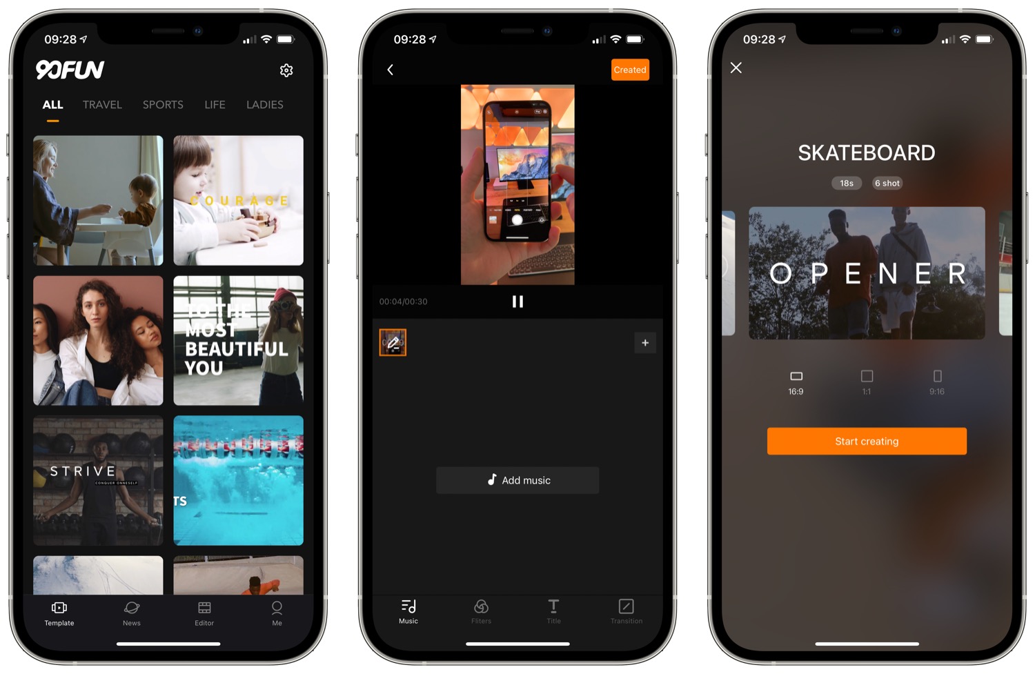 Die App bietet aber auch zusätzlich einen Editor und Vorlagen. Der Editor ist rudimentär und bietet Basisfunktionen. Videos können geschnitten und bearbeiten werden, ihr könnt Filter anwenden, Übergänge hinzufügen oder Text auf das Video legen. Hier könnt ihr auch Videos aus eurer Bibliothek wählen, die nicht mit dem Morange M1 Pro geschossen wurden. Aber: Wer nur einen Video-Editor sucht, sollte sich andere Apps mit mehr Funktionen ansehen.