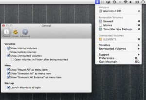 Mountain (App Store-Link) ist gerade einmal 2 MB groß und somit schnell installiert. Das Tool nimmt einen Platz in der Systemleiste ein, über die es auch gesteuert wird. Mit wenigen Klicks bekommt man eine Übersicht aller angeschlossener Geräte und kann sie schnell auswerfen oder aber auch erneut aktivieren.