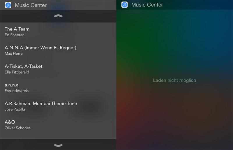 Music Center (App Store-Link), das seit dem 21. November dieses Jahres kostenlos aus dem App Store geladen werden kann, soll es möglich machen, die eigene iOS-Musikbibliothek über ein kleines Widget in der Mitteilungszentrale anzuzeigen. Dazu kann entweder eine Listen- oder Albumcover-Ansicht ausgewählt werden. Die 11,8 MB große Anwendung fordert für ihre Dienste iOS 8.0 oder neuer auf iPhone oder iPad ein und bietet außer dem kleinen Widget samt seiner Konfigurations-Optionen keine weiteren Funktionen.