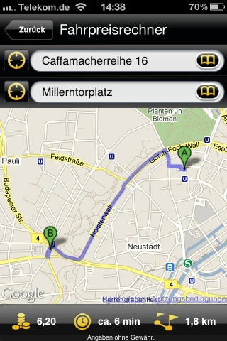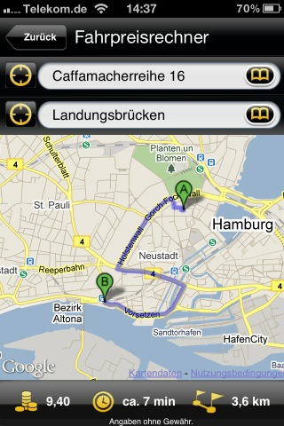 Damit man sich ungefähr darauf einrichten kann, wie viel die Fahrt kostet, ist in myTaxi auch ein Fahrpreisrechner eingebaut. Nach Eingabe der Zieladresse berechnet die App den Taxipreis – bei unserer Fahrt vom Hamburger Gänsemarkt bis zu den Landungsbrücken übrigens auf 20 Cent genau.