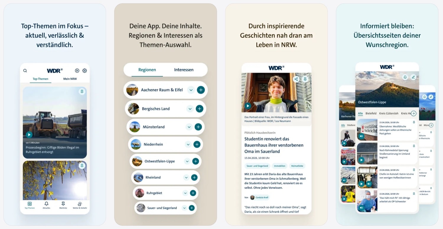 Im Bereich „Mein NRW“ kann man gezielt Regionen und Themen auswählen, für die man sich interessiert. So kann ich Nachrichten aus dem Ruhrgebiet verfolgen, muss mich aber nicht mit lokalen Meldungen aus der Eifel herumschlagen. Und da ja schon mit dem Rundfunkbeitrag gezahlt wird, gibt es in der App auch keine Werbung und keine Paywalls.