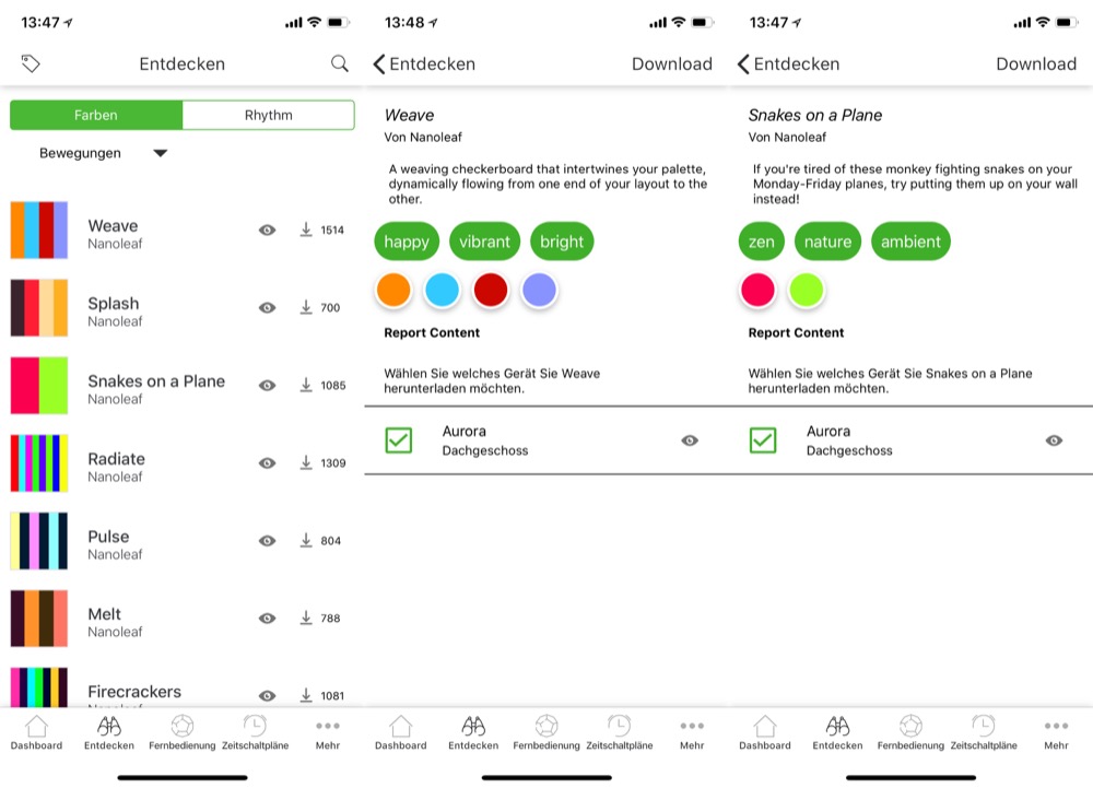 Nachdem alle Updates erledigt sind, könnt ihr innerhalb der App die neuen Bewegungseffekte finden. Am einfachsten funktioniert das über den Entdecken-Bereich, wo ihr einfach den Filter „Bewegungen“ aktiviert und so neun neue animierte Szenen des Nanoleaf-Teams findet. Einen guten Eindruck über die neuen Möglichkeiten verschafft euch „Shakes on a Plane“.