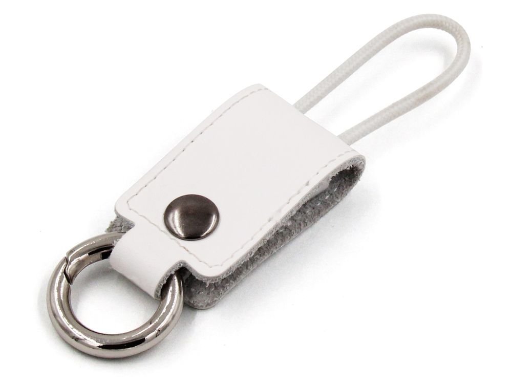 Leider fällt die Beschreibung auf der Webseite von Gravis sehr überschaubar aus. Erkennbar ist allerdings ein runder Schlüsselrund und ein zur Schlaufe gebundenes Lightning-Kabel. Verbunden ist das ganze mit einer Lasche aus Echtleder.