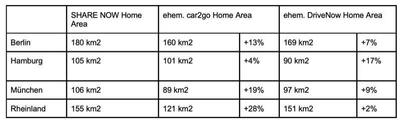 Anhand von vier Beispielen kann man in der folgenden Tabelle sehr gut sehen, wie sich die einzelnen Geschäftsbereiche mit dem Zusammenschluss vergrößern. Insbesondere die bisherigen Kunden von car2go im Rheinland und München profitieren: