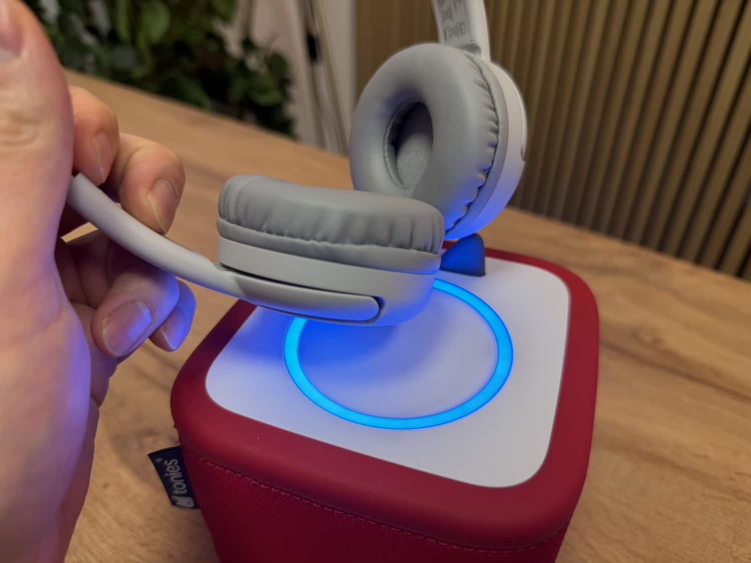 Ihr könnt die Toniebox 2 auch mit anderen Kopfhörern koppeln. Um die Box nach Bluetooth-Geräten suchen zu lassen, dreht man sie einfach auf den Kopf und drückt ein Ohr für fünf Sekunden. Danach blinkt der LED-Ring blau. Versetzt man dann Bluetooth-Kopfhörer in den Kopplungsmodus, verbinden sie sich automatisch mit der Toniebox.