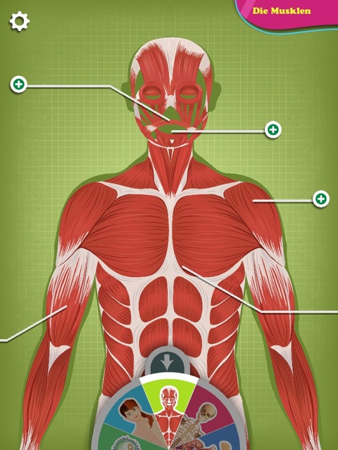 Mit einem kleinen Rädchen am unteren Bildschirmrand lässt sich durch die einzelnen Körperregionen und -abschnitte navigieren. Jede Lektion ist dabei noch mit zusätzlichen, oft interaktiven Elementen versehen. Tippt man beispielsweise in der Skelett-Ansicht auf ein Puzzle-Teil am unteren rechten Bildrand, wirbelt die App die Skelett-Teile durcheinander, so dass man sie selbst wieder an der richtigen Stelle des Körpers ablegen muss.