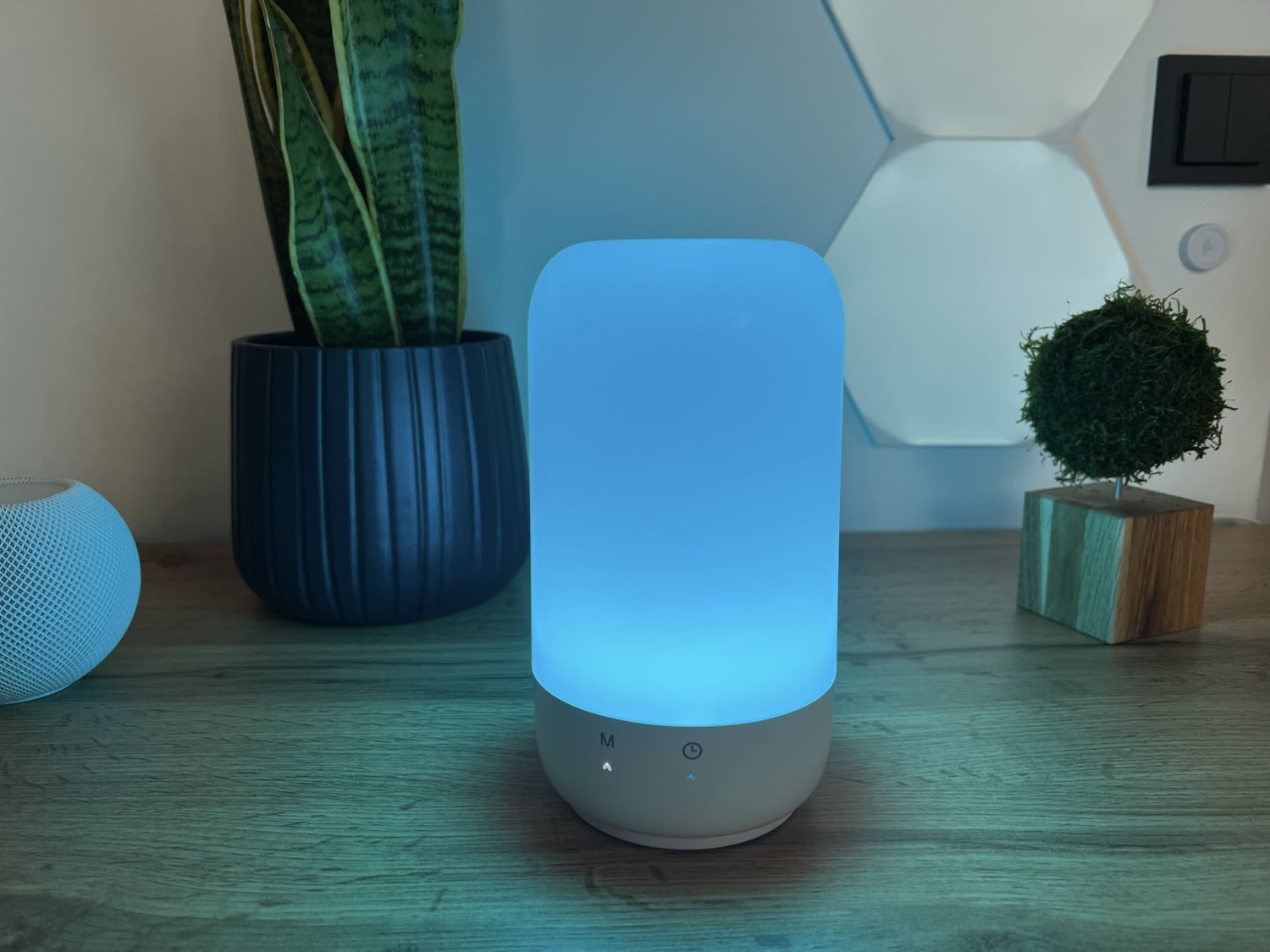 Oberhalb befindet sich der An-Aus-Knopf, der über zusätzliche Funktionen verfügt. Mit einem kurzen Klick schaltet man die Lampe ein. Wenn man jetzt kurz drückt, kann man die Farbe ändern, mit einem langen Klick wird die Helligkeit stufenweise angepasst. Auf der Front befinden sich zudem eine M- und eine Timer-Taste. Mit einem Touch auf das M kann man zwischen dem Modus Farbe und Weiß wechseln, ein Klick auf den Timer aktiviert einen Countdown. Nach einer voreingestellten Zeit geht die Lampe dann automatisch aus. In HomeKit kann man die Zeit jedoch nicht ändern, das geht nur in der Meross-App.