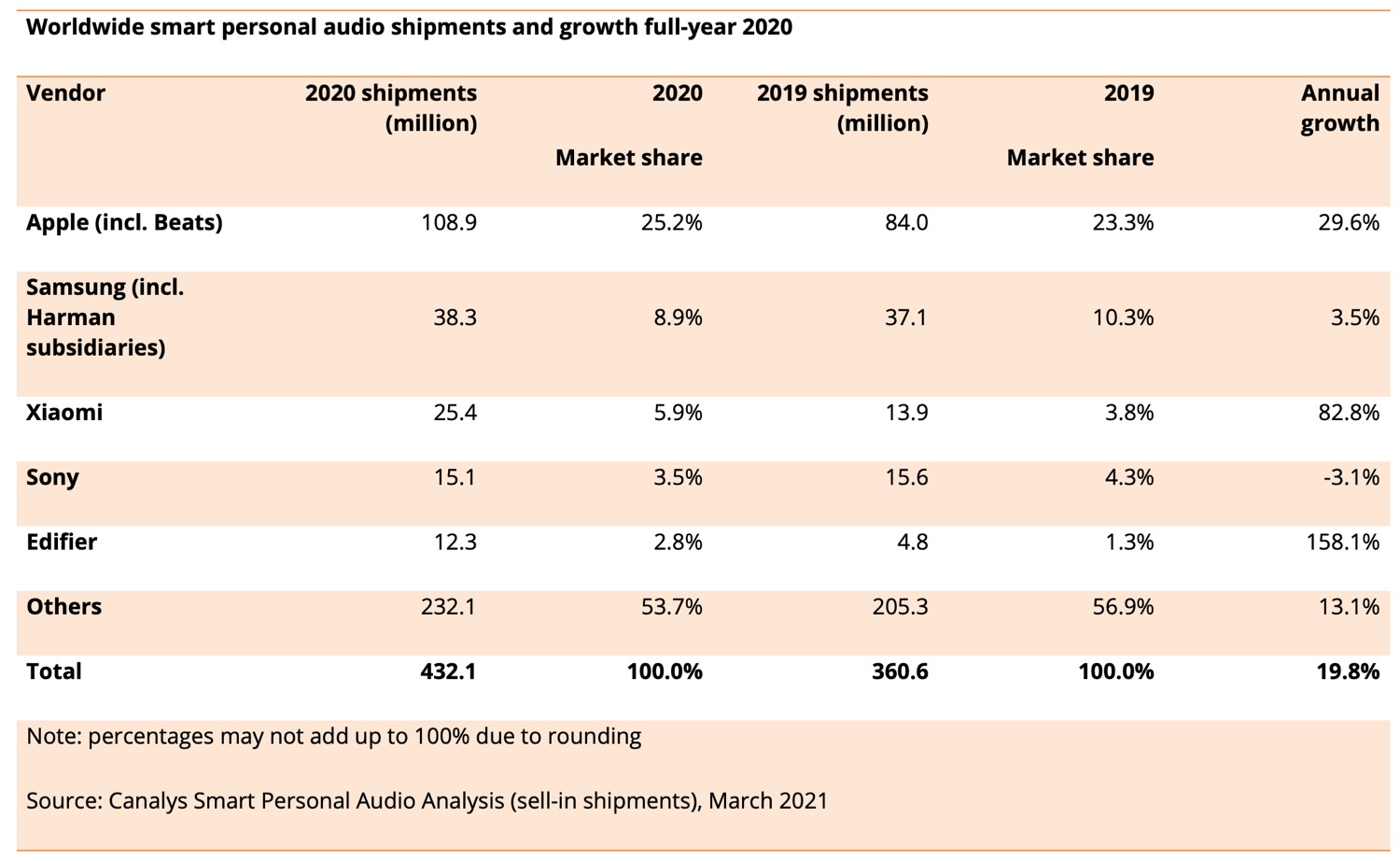 Eine neue Studie von Canalys zeigt auf, dass Apple im Bereich True Wireless Kopfhörer und Wearables klar den Markt anführt. Insgesamt hat Apple 108,9 Millionen „Smart Personal Audio“ Geräte verkauft. Das entspricht einem Marktanteil von 25,2 Prozent. Im Vorjahr wurden lediglich 84 Millionen Geräte verschickt.