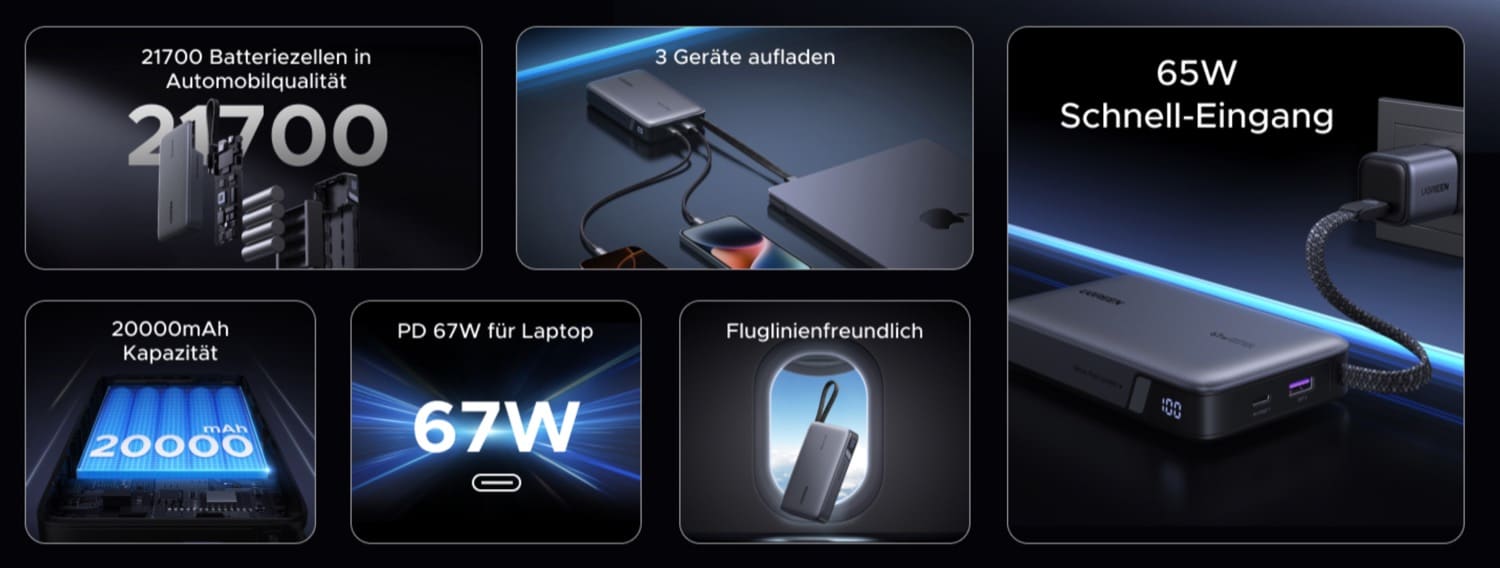 Und da wäre auch schon das nächste neue Gadget von Ugreen. Seit heute erhaltet ihr auf Amazon die neue Ugreen Nexode Powerbank mit einer Kapazität vom 20.000 mAh und einer Leistung von 67 Watt für einen Listenpreis von 49,99 Euro. Direkt zum Start ist ein Coupon verfügbar, dank dem sich der Preis auf nur noch 39,99 Euro (Amazon-Link) reduziert. Was genau bekommt ihr dafür?