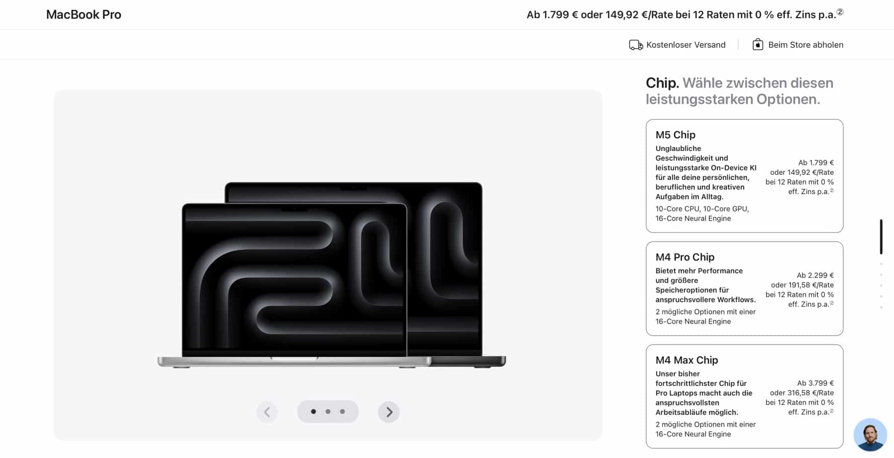 Beim MacBook Pro beginnt der Bestellprozess beispielsweise mit der Wahl zwischen 14 oder 16 Zoll, anschließend folgen Farbe, optionales Nano-Textur-Display, Chip-Variante, RAM, SSD, Netzteil und Tastaturlayout. Vorgefertigte Konfigurationen gehören damit der Vergangenheit an.