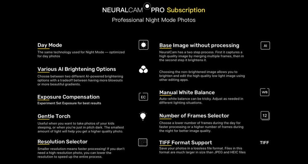 Mit dem nun erfolgten Update auf Version 1.4, das ab sofort im deutschen App Store zum Download zur Verfügung steht, haben die Macher der App jetzt ein optionales Pro-Abonnement eingeführt, das weitere Premium-Features in NeuralCam ermöglicht. Das Abo ist zum Preis von 3,49 Euro/Monat bzw. 22,99 Euro/Jahr erhältlich und enthält unter anderem einen Tagmodus, verschiedene KI-basierte Aufhellungs-Optionen, eine Möglichkeit, die Anzahl der Frames festzulegen, einen manuellen Weißabgleich, einen Export als TIFF-Datei und eine Auswahl an verschiedenen Bildauflösungen zum Speichern.