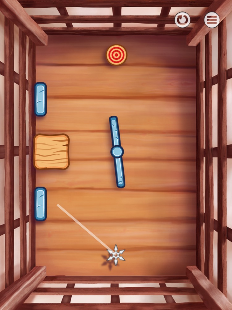 In den insgesamt vier Welten warten je 18 Level drauf gespeilt zu werden. Das Prinzip ist dabei denkbar einfach. Der Ninja-Stern muss auf die Ziel-Plattform geworfen werden. Damit die Aufgabe nicht zu einfach ist, gilt es verschiedene Objekte und Eigenschaften zu beachten. Im Holz bleibt der Stern natürlich sofort stecken, an an aus Stein gefertigten Hindernissen kann er hingegen abprallen. Im Verlauf des Spiels werdet ihr auf weitere Gefahren treffen, zum Beispiel Strom oder Eis.