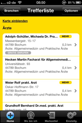 Die Suche ist auch in den einzelnen Kategorien vorhanden. Man sucht entweder in einem bestimmten Ort oder in der Nähe der aktuellen Position. Aus der Liste der Suchergebnisse kann man sich seinen Favoriten heraussuchen und mit einem Klick weitere Informationen aufrufen, zum Beispiel Adresse, Telefonnummer oder Webseite – schmerzlich vermisst wird von uns eine Anzeige den Öffnungszeiten oder Sprechstunden, die leider nur bei sehr, sehr wenigen Suchergebnissen angezeigt werden. Dafür kann man bestimmte Ärzte, Anwälte oder Suchergebnisse aus anderen Branchen einfach zur Kurzwahl oder dem Merkzettel hinzufügen.