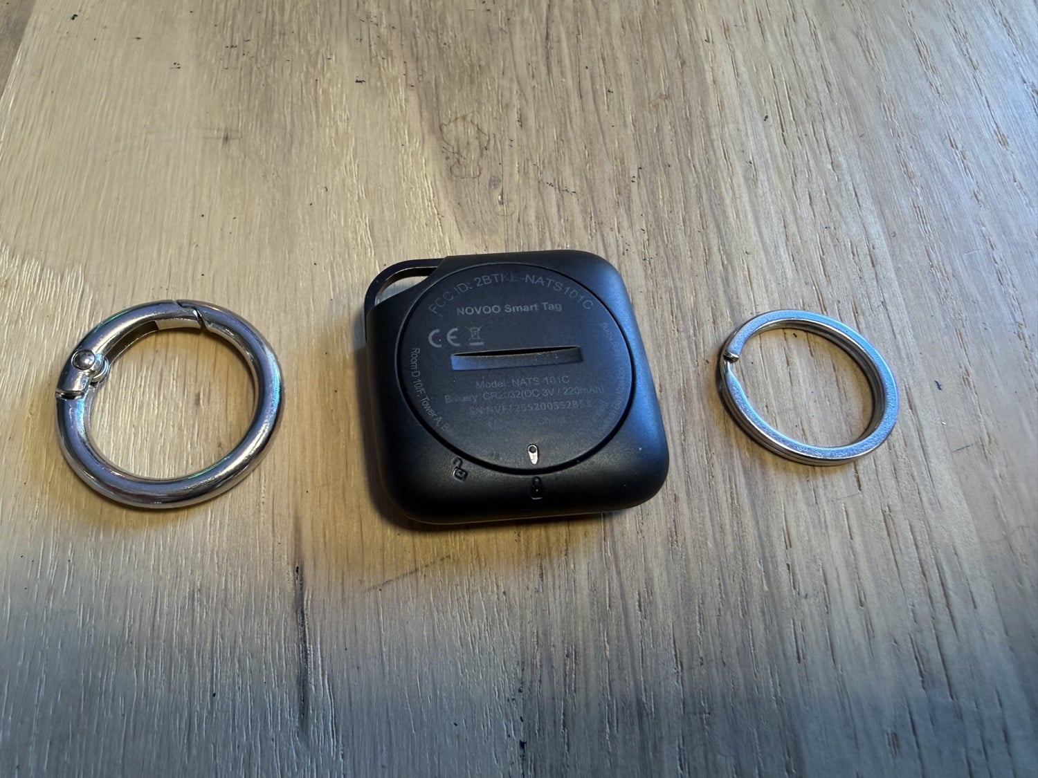 Der Novoo Smart Tag wird ganz normal mit einer CR2032-Knopfzelle betrieben, sie soll etwas mehr als ein Jahr halten. Im Lieferumfang ist eine kleine Münze enthalten, um die Batterie-Abdeckung leicht zu öffnen. Außerdem bekommt ihr vier kleine, klassische Schlüsselringe und vier etwas größere Schlüsselringe mit Karabiner-Funktion. Am Tag selbst gibt es eine kleine Aussparung, an der ihr den Schlüsselring befestigen könnt.