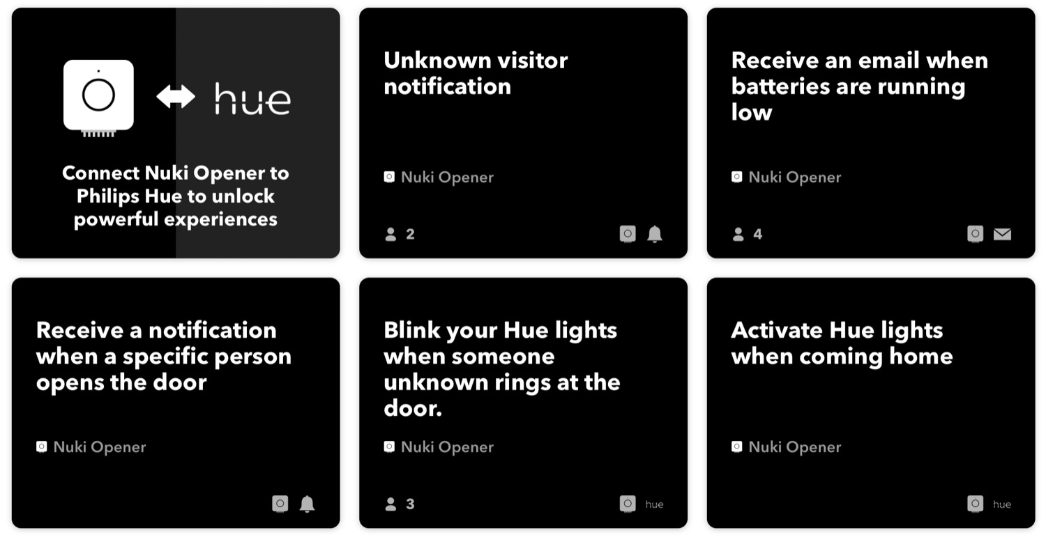 Und wenn ihr noch mehr Funktionen wünscht, könnt ihr einen Blick auf die neue IFTTT-Anbindung vom Nuki Opener werfen. Ihr könnt so zum Beispiel eine Verbindung zu Philips Hue aufbauen und die Lampen in einer besonderen Farbe aktivieren, wenn ein Unbekannter an eurer Tür klingelt. Ihr könnt alle Schließvorgänge in einer Google-Tabelle listen, eine E-Mail erhalten, wenn die Batterien fast leer sind und vieles mehr. Natürlich könnt ihr auch neue Rezepte mit eigenen Abfolgen anlegen.