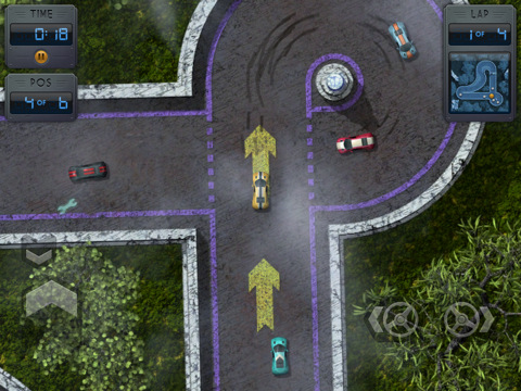 Auch in Sideways Racing (App Store-Link) steuert man das Spiel aus der Vogelperspektive. In unterschiedlichen Spielmodi treten bis zu zehn Fahrzeuge auf einmal gegeneinander an, zur Verfügung stehen neben neun Rennstrecken auch Trainings-Kurse und Bonus-Tracks.