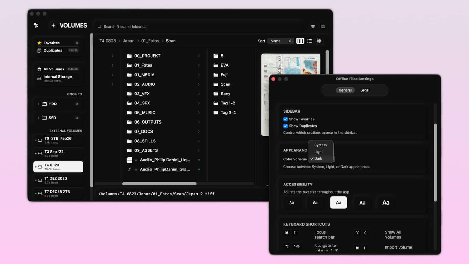 Die Suche in Offline Files lässt sich nach Dateityp, Größe, Erstellungs- und Änderungsdatum filtern. Ihr könnt Laufwerke außerdem in Volume Groups zusammenfassen, etwa nach Projekten oder Kunden. Die App erkennt doppelte Dateien über alle indexierten Volumes hinweg und zeigt sie gruppiert nach Größe an. Für einzelne Dateien steht eine Vorschau mit QuickLook-Integration und erweiterten Metadaten bereit.