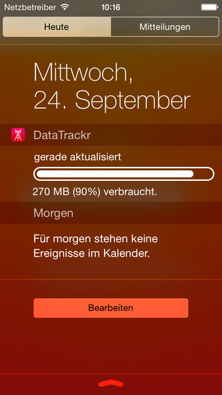 DataTrackr: Ein wirklich hübsches Widget für iPhone-Nutzer im Telekom-Netz und Vodafone-Vertragskunden. Wenn ihr im mobilen Netz unterwegs seid, verrät ein Widget in der Mitteilungszentrale, wie viel Datenvolumen ihr schon verbraucht habt – sowohl in MB als auch in Prozent. Weitere Funktionen sind in DataTrackr nicht vorgesehen. In den Einstellungen könnt ihr eine Erinnerung setzten, die sich dann zu Wort meldet, wenn das Volumen eine kritische Grenze erreicht hat, auch lässt sich hinterlegen, in welchem zeitlichen Abstand die Daten aktualisiert werden. (89 Cent, iPhone, kompletter Bericht)
