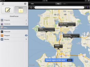 Aber auch sonst braucht sich OmniFocus nicht verstecken. In der iPad-Version kann man zum Beispiel blitzschnell zwischen verschiedenen Ansichten für anstehende Aufgaben zu wechseln – es gibt sogar eine Karte, auf denen Aufgaben nach Orten geordnet werden. Praktisch zum Beispiel für Personen, die Kunden abklappern müssen.