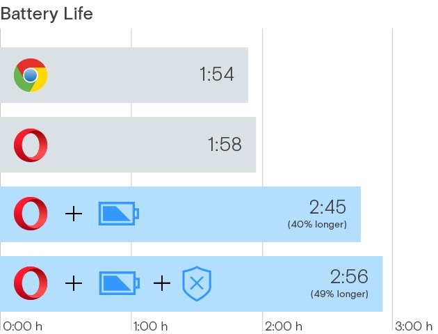 Natürlich sind die Macher bei Opera keine Zauberkünstler. Mit geschickten Einstellungen, die sich kaum auf das Nutzerverhalten auswirken, kann man die Laufzeit schnell verlängern. Unbenutzte Plugins werden deaktiviert, die Hintergrundaktivitäten verringert und der JavaScript-Timer angepasst. Animationen werden gestoppt und die Bildfrequenz auf 30 Bilder pro Sekunden reduziert. Durch diese Einschränken soll die Surfgeschwindigkeit nicht beeinträchtig werden.