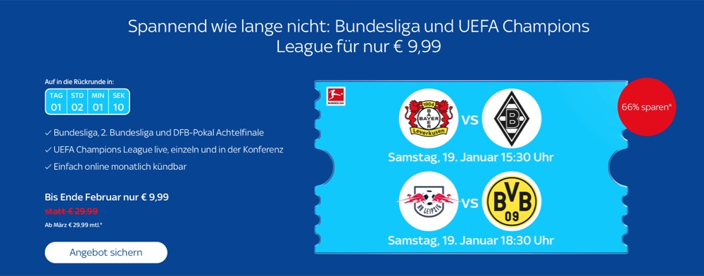 Wenn es kein Vertrag über 12 oder 24 Monate sein soll, ist Sky Ticket die richtige Anlaufstelle. Und das Supersport Ticket ist jetzt im Angebot und kostet jetzt nur 9,99 Euro statt 29,99 Euro. Dann könnt ihr nicht nur die Bundesliga, sondern auch die 2. Bundesliga, das DFB-Pokal Achtelfinale sowie ausgewählte Spiele der UEFA Champions League sehen.