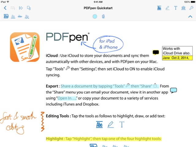 In der Tat lassen sich mit PDFpen 2 PDF-Dokumente auf dem iPhone oder iPad nicht nur lesen, sondern auch auf vielfältige Art und Weise bearbeiten. So kann beispielsweise ein Formular mit einer handschriftlichen Unterschrift versehen werden, und auch Notizen oder Unterstreichungen hinzugefügt werden. Dazu stehen verschiedene Farben und auch unterschiedliche Muster wie Durch- und Unterstreichung, eine Textmarker-Funktion, aber auch Formen wie Ellipsen, Linien, Polygone oder Pfeile bereit.