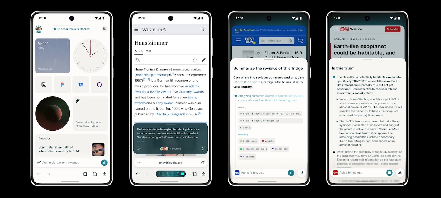 Dabei wurde die mobile Version der Comet-App im Vergleich zur Desktop-App auch für die Nutzung auf Mobilgeräten optimiert, das heißt, ihr findet hier eine etwas andere Nutzerführung als in der Version für Mac. Der integrierte KI-Assistent bildet dabei die Hauptfunktionalität der App. Er ist ständig verfügbar und steht euch Rede und Antwort bei euren Fragen, auch auf der jeweils aufgerufenen Webseite.