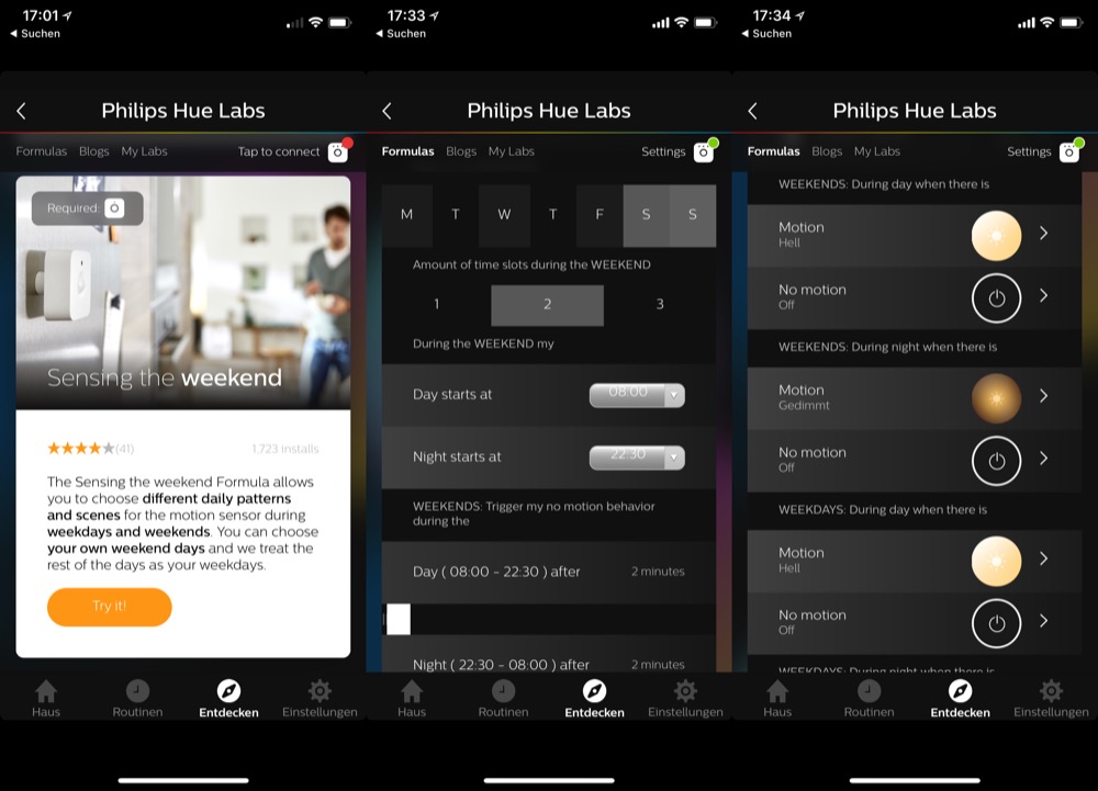 Hue Labs findet ihr im Entdecken-Bereich der Hue-App und könnt so auf das leider nur in englischer Sprache verfügbare Rezept „Sensing the Weekend“ zugreifen. Dort könnt ihr die zum Wochenende gehörigen Tage auswählen, also beispielsweise Samstag und Sonntag oder Freitag bis Sonntag. An diesen Tagen sind sogar bis zu drei statt nur einem oder zwei Zeitbereichen möglich, hier könnt ihr jeweils die gewünschten Räume und die zu aktivierenden Szenen auswählen. Allerdings müssen auch alle anderen Einstellungen des Bewegungsmelders über die Beta-Funktion vorgenommen werden, was aktuell noch nicht ganz so praktisch ist, wie die gewohnte Konfiguration.