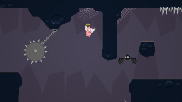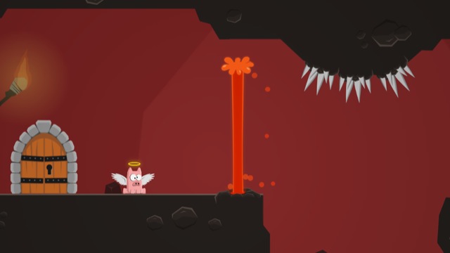 Dieses Unterfangen gestaltet sich in den ersten von 80 Leveln in vier verschiedenen Welten zunächst auch noch relativ einfach. Die Steuerung erfolgt über zwei Buttons am linken und rechten unteren Bildschirmrand, über die das rosafarbene Schwein entweder nach links oder nach rechts fliegen kann. Es gilt also, eine gute Balance zwischen diesen beiden Flügelschlägen zu finden, um das Schweinchen durch die unwegsamen Umgebungen in der Hölle zu bugsieren.
