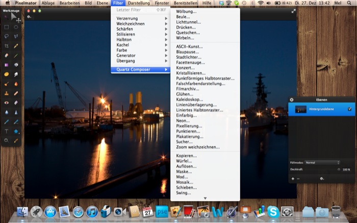 Der Anwender, der schon mit der Photoshop-Suite vertraut war, wird sich auch sofort in der Pixelmator-App zurechtfinden, denn das Programm verfügt über ein fast identisch aufgebautes Layout. Am linken Bildrand befinden sich die verschiedenen Werkzeug-Symbole, in der Menüleiste können weitere Optionen zur Bearbeitung, Filter und Ansicht ausgewählt werden, und am rechten Rand findet sich die Ebenenansicht.