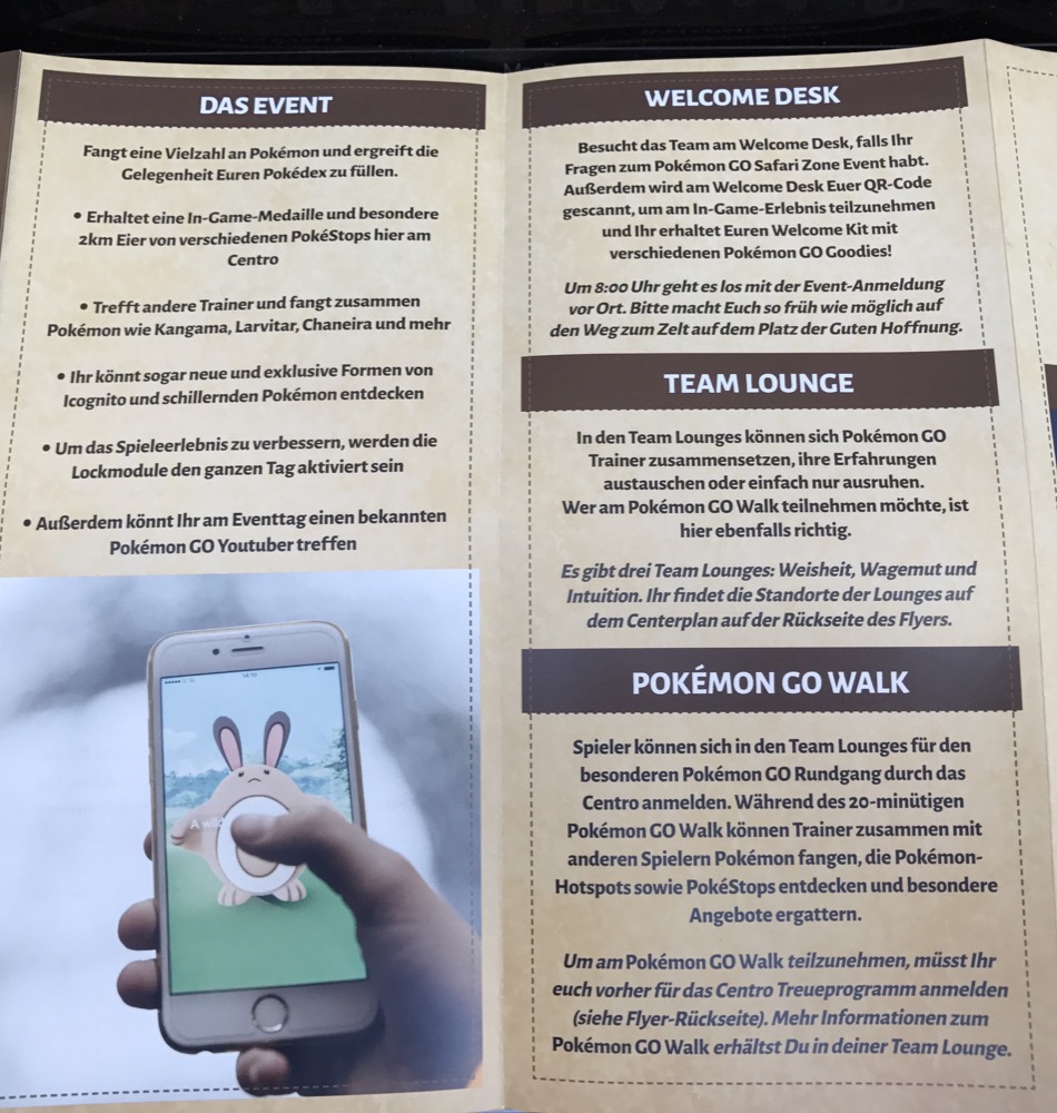 Zusätzlich hat das CentrO Pokewalks angeboten. Hier musste man sich zuvor anmelden und konnte dann in einer kleinen Gruppe die wichtigsten Orte im und um das CentrO erkunden. Der Gruppenleiter hat ein paar Infos erzählt, natürlich konnte man weiterhin Pokémon fangen. Da ich das CentrO wirklich sehr gut kenne, habe ich die Walks als langweilig empfunden.