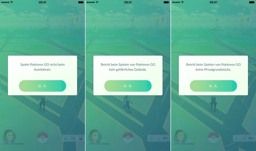 Ist die neuste Version installiert, gibt es direkt nach dem Start von Pokémon GO Warnhinweise. Man solle keine privaten Gebiete betreten, nicht beim Autofahren spielen und ähnliches. Des Weiteren können die eigenen Profile jetzt individualisiert werden, auch die Ansicht aller gefangenen Pokémon wurde optimiert. Das Verschicken von Pokémon ist etwas einfacher geworden. Zudem wurde die Karte deaktiviert, die anzeigte, wo das Pokémon gefangen wurde.